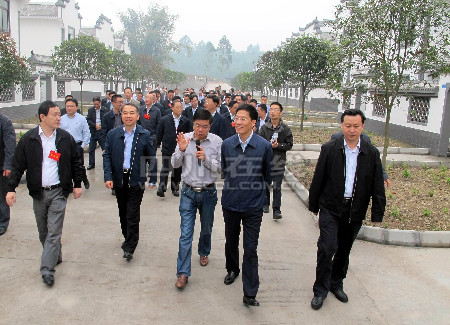 参会人员来到犍为县双溪乡柳溪新居。该新居规划占地450亩,依托清溪历史文化名镇和万亩茉莉花海,打造集休闲、观光、体验于一体的城乡结合型和乡村旅游型新村聚居点,建成后可聚居农户720户。整个新居按照“统一标准、统一规划、统一实施原则”,采用委托联建方式建设,并由政府统一配套基础设施和公共服务设施。新居一期工程于2013年6月开工建设,目前已全部竣工。