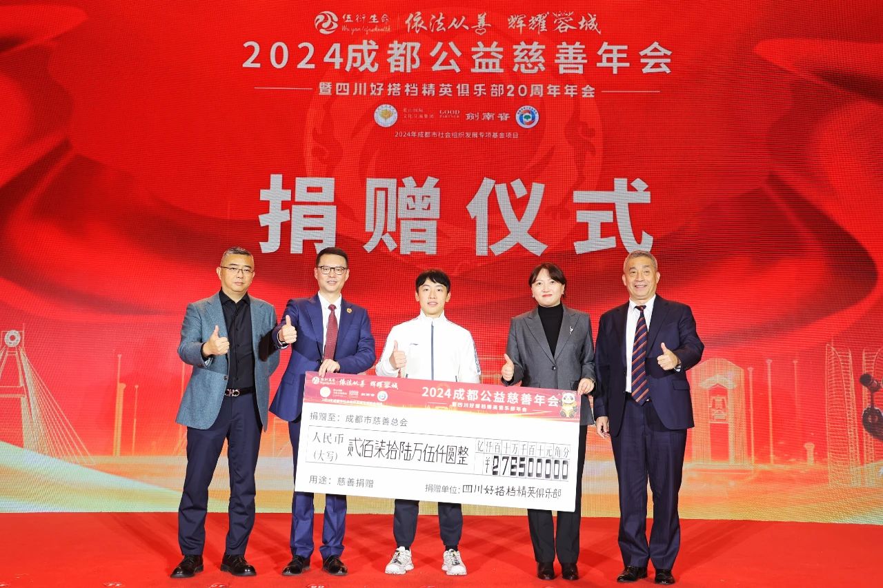 2025年1月11日,伍衍生命“依法从善 辉耀蓉城”2024成都公益慈善年会暨四川好搭档精英俱乐部20周年年会在成都市举行。此次年会由成都市慈善总会主办,四川好搭档精英俱乐部、成都市慈善总会好搭档慈善基金、民革成都市委双流总支、青羊区新的社会阶层人士联谊会联合主办,成都市中小企业协会承办,成都市社会组织促进会协办,并得到伍衍生命国际健康产业集团、蓝山国际文化交流集团等多家爱心企业的鼎力支持。