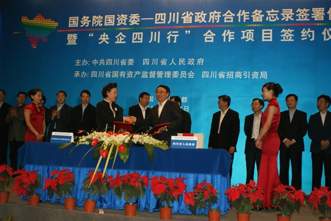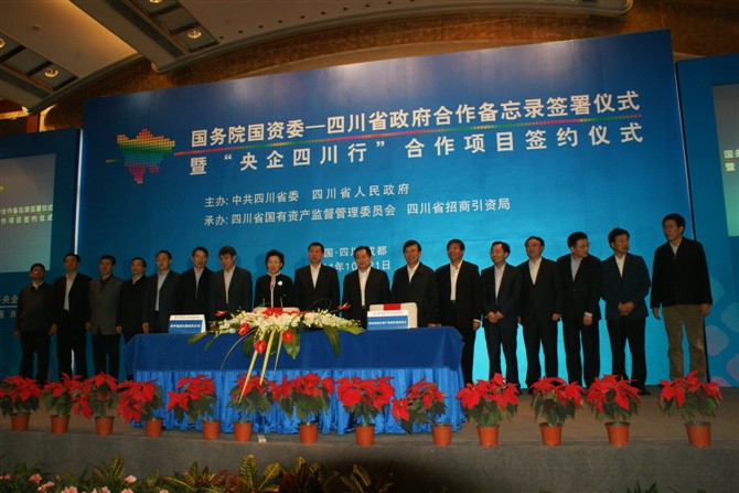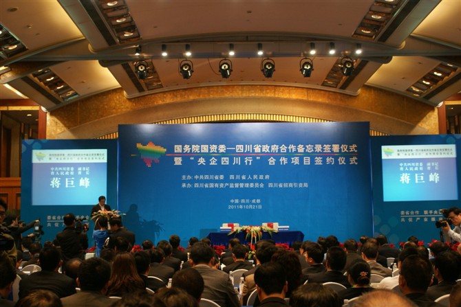 作为中国第十二届西博会的重大专项活动之一,由中国四川省委,四川省人民政府主办,四川省国资委、省招商局共同承办的国务院国资委——四川省政府合作备忘录签署仪式暨“央企四川行”合作项目签约仪式于2011年10月21日在成都如期举行。省委副书记、省长蒋巨峰,省委副书记、成都市委书记李春城,省人大常委会副主任、省国资委党委常委副书记、主任彭渝,省政府副省长黄小祥、刘捷,成都市长葛红林,省政府秘书长余伟,副秘书长蔡竞等领导出席了国务院国资委——四川省政府合作备忘录签署仪式暨“央企四川行”合作项目签约仪式。仪式由省委副书记、成都市委书记李春城主持。